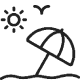 A serene beach scene with sun loungers, umbrellas, and a view of the ocean under a partly cloudy sky at sunset.